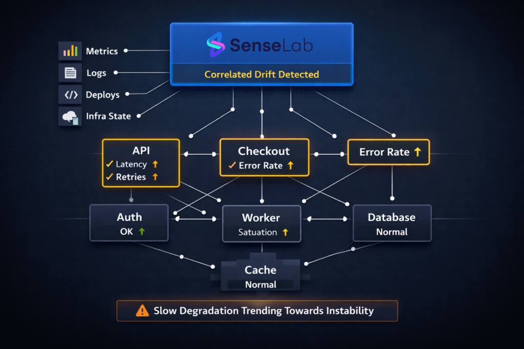 SenseLab continuously correlates logs, metrics, deploys, and infrastructure changes to detect emerging risk before it turns into a page.